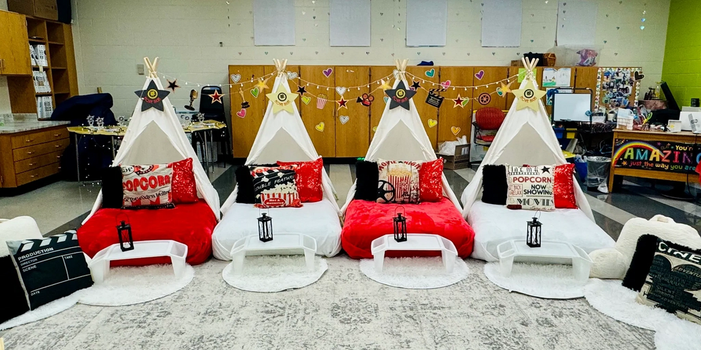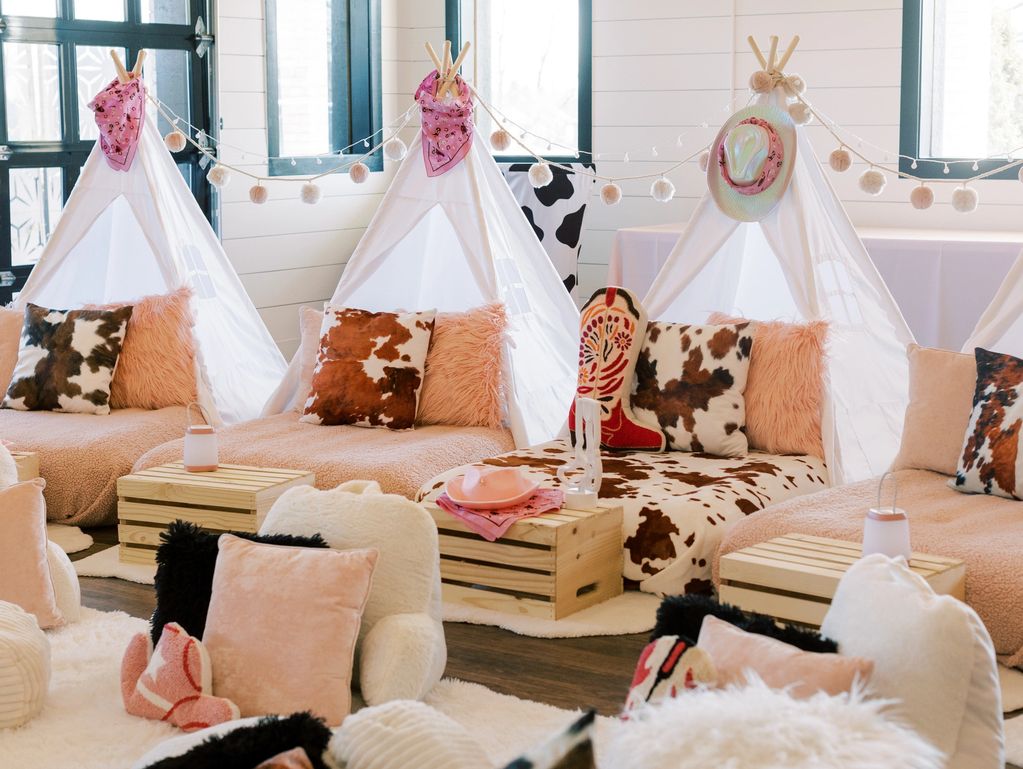 Elaina's 3rd birthday party - teepee tents and lounge area for a cozy movie time!