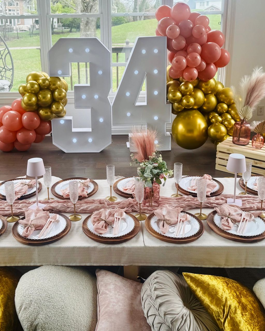 Luxury picnic party with light up marquee sign and balloon decor to celebrate Jen's 34th birthday.