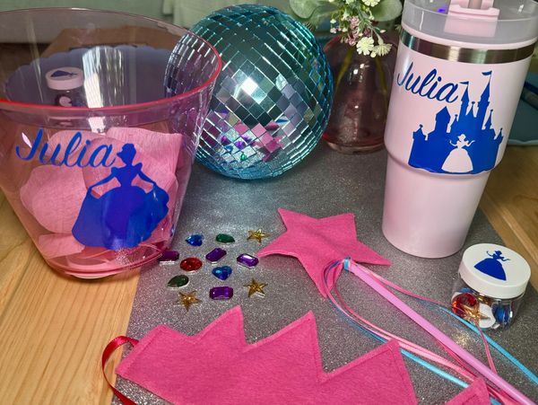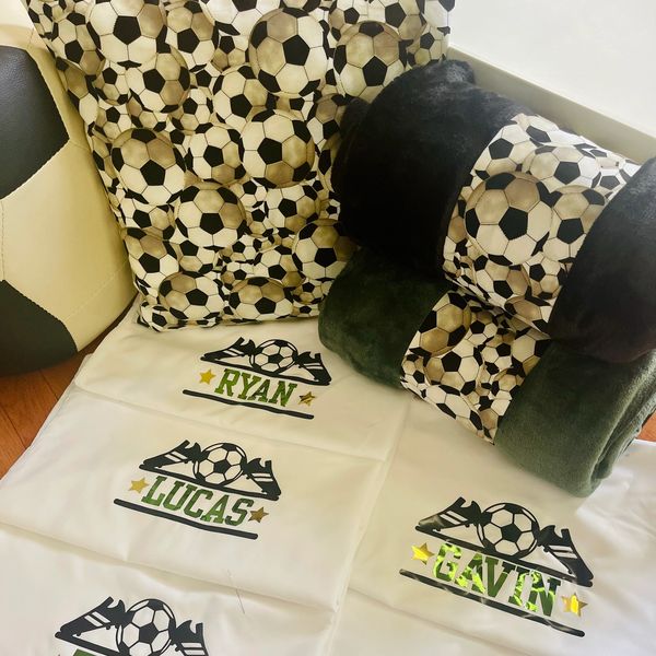 Throw blanket and pillows, personalized pillowcases and cups (for the kids to take home), tray table and lamp. Everything will be customized according to the party theme or color combination of your choice.